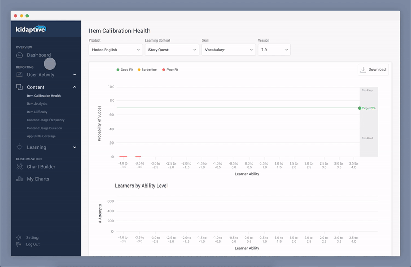 Kidaptive's Adaptive Learning Platform (ALP) brings adaptive learning into Educational products. We are working with educational companies (partners) to capture their student data to provide a personalized learning experience. We received requests from our partners about the need for data analytics tools where they could review education-centric metrics to make better product decisions.