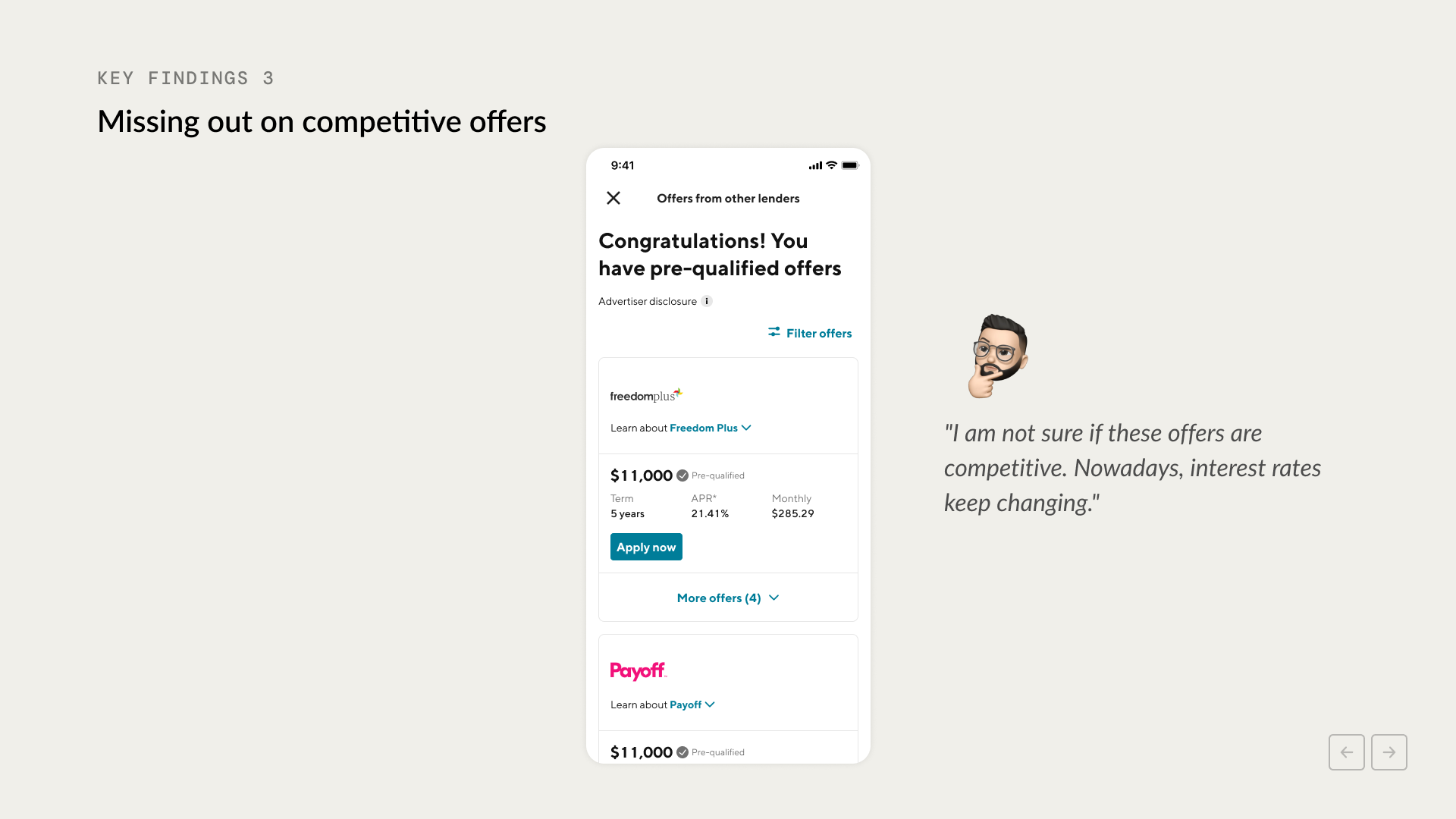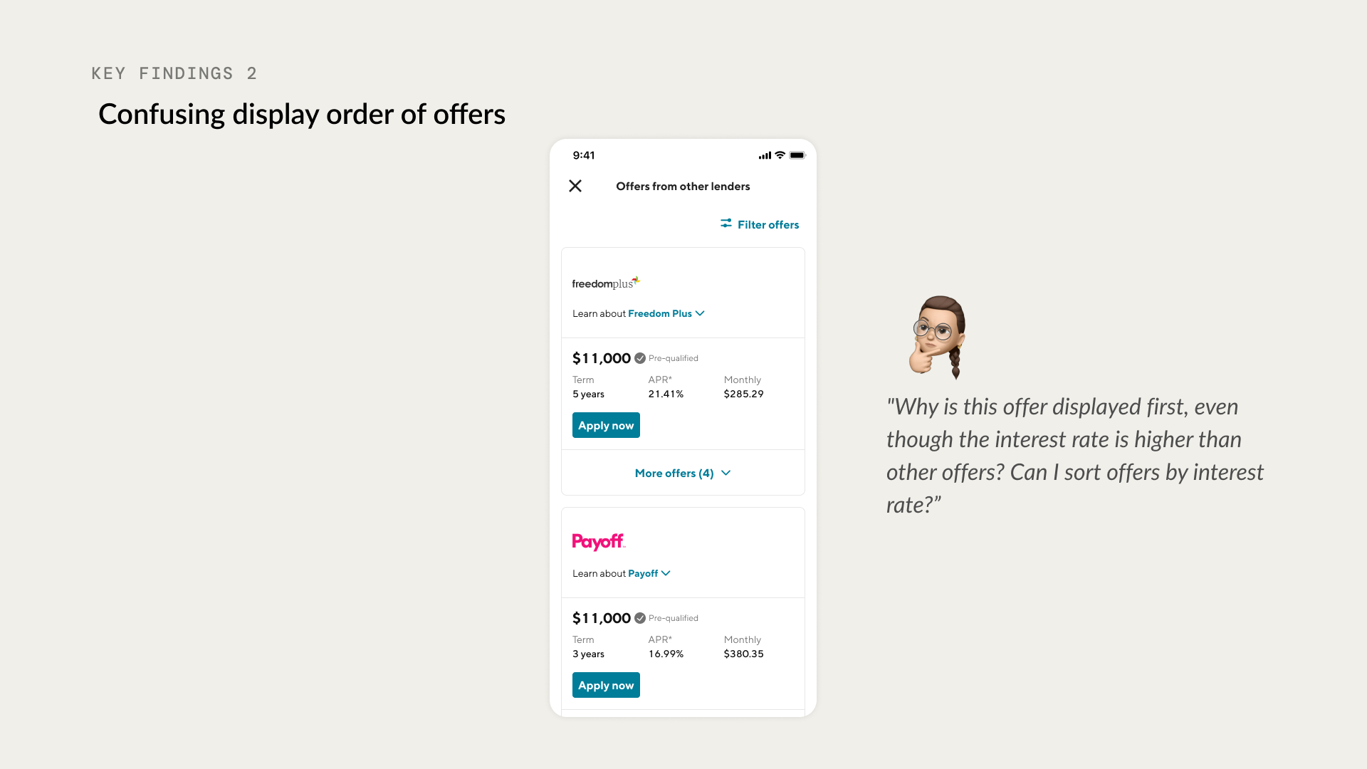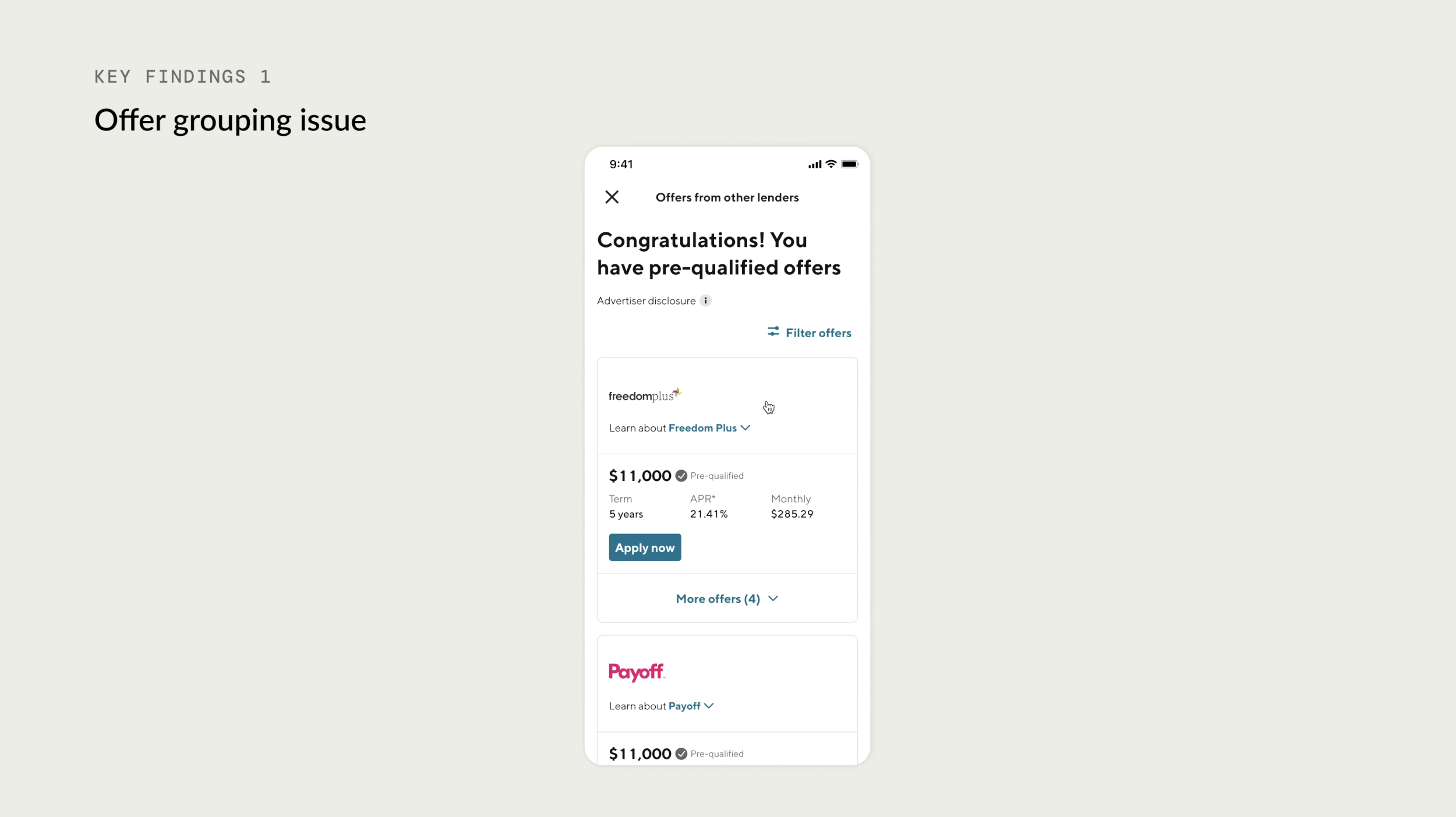 Offer grouping issue: Grouping offers by lenders makes it hard for users to compare. This is particularly difficult when trying to compare APR, which is a top priority for users.