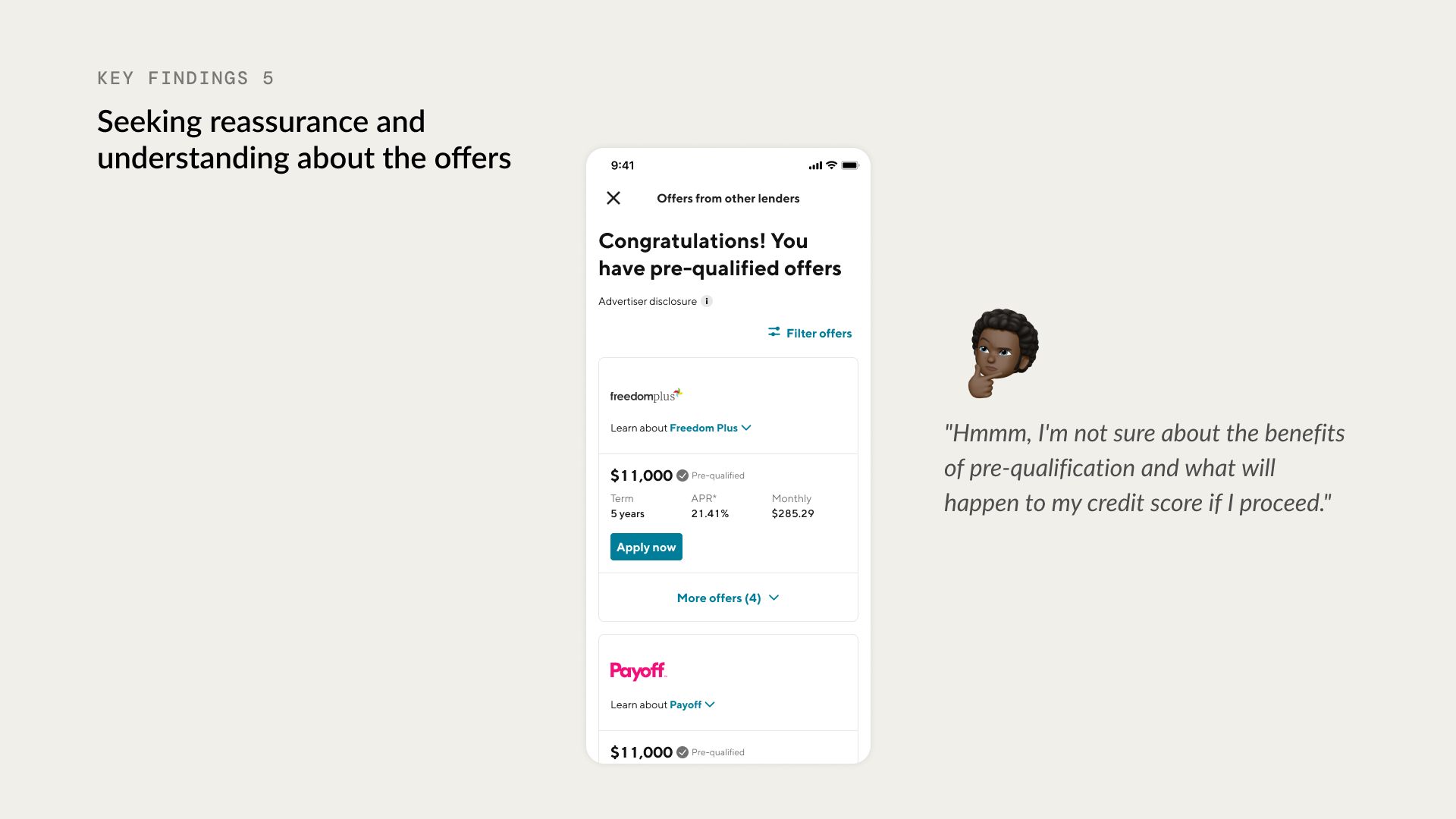 5. Seeking reassurance and understanding about the offers: Users need reassurance about the benefits of pre-qualification and the credit score impact when accepting offers.