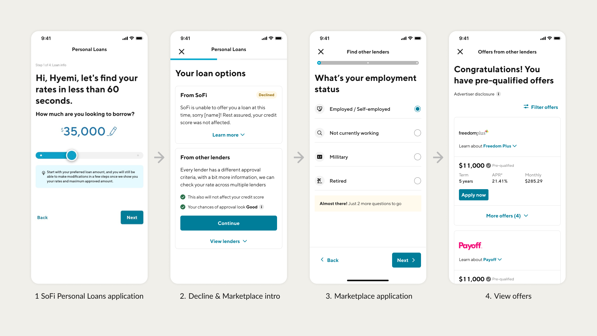 Decline & Marketplace intro: The user receives a decline from the SoFi personal loan and is presented with an introduction to the marketplace options.