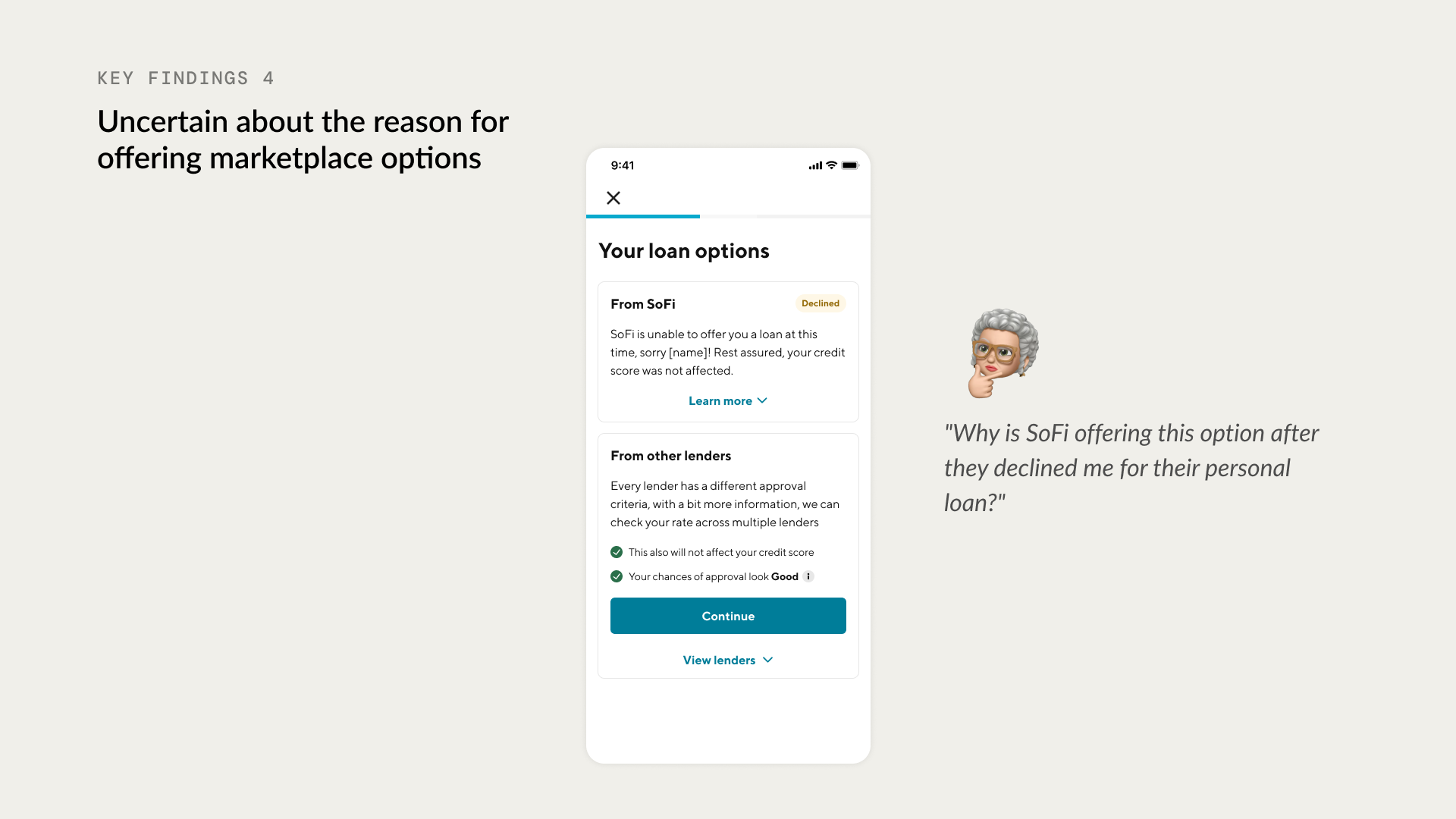 4. Uncertain about the reason for offering marketplace options: Users want to know why SoFi is recommending other lenders when they are unable to provide a personal loan.